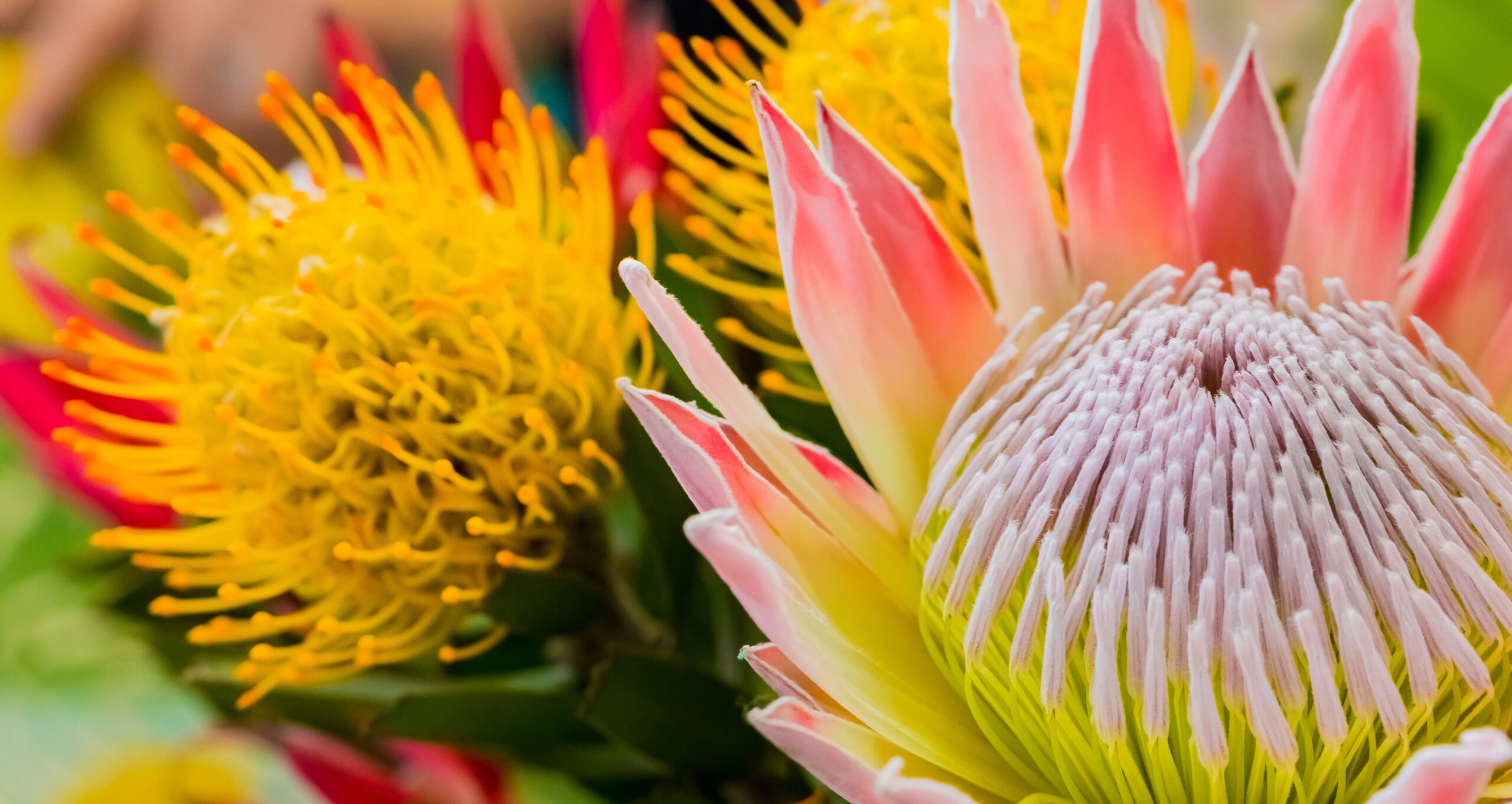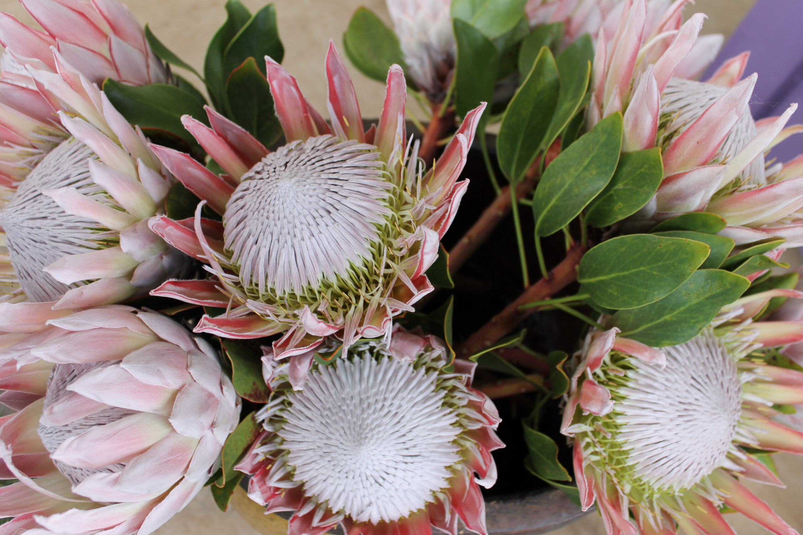 Proteas (Proteaceae): Iconic flowering plants native to South Africa, admired for their large, dramatic flower heads and leathery foliage, often used in floral arrangements and landscaping.