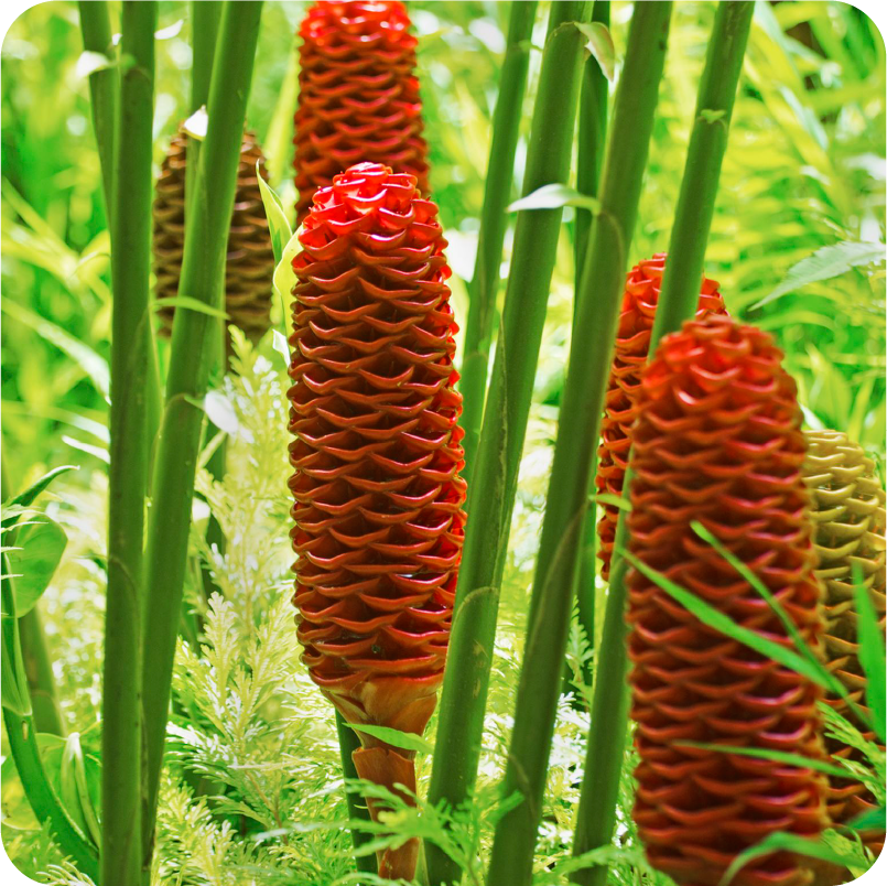Large dome- or cone-shaped flower heads surrounded by colorful bracts in shades of pink, red, cream, or green.